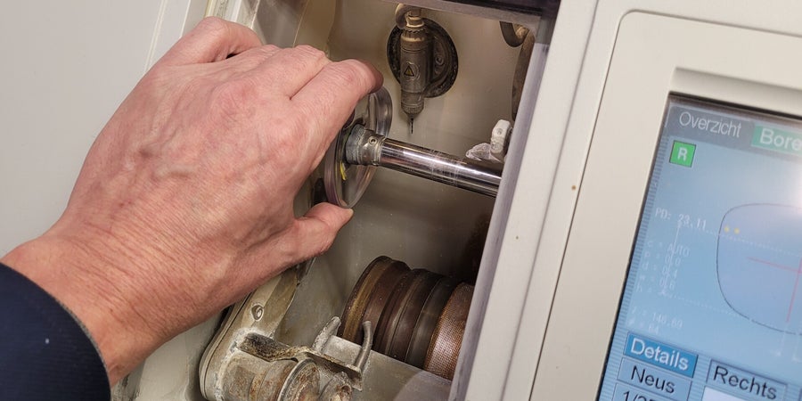 Glasbril: Onze geavanceerde inslijpmachine zorgt voor precies geslepen glazen en boorgaten die perfect passen bij randloze brillen.